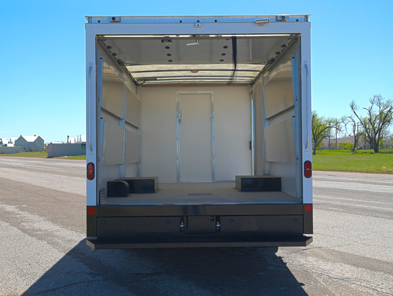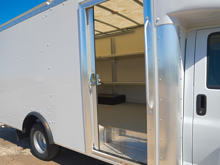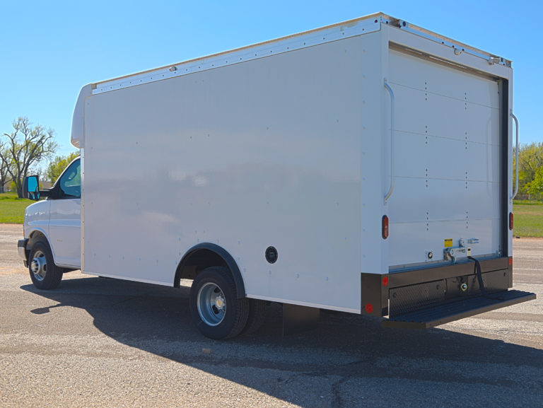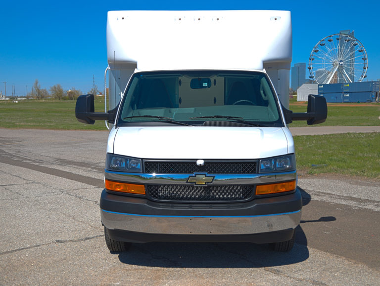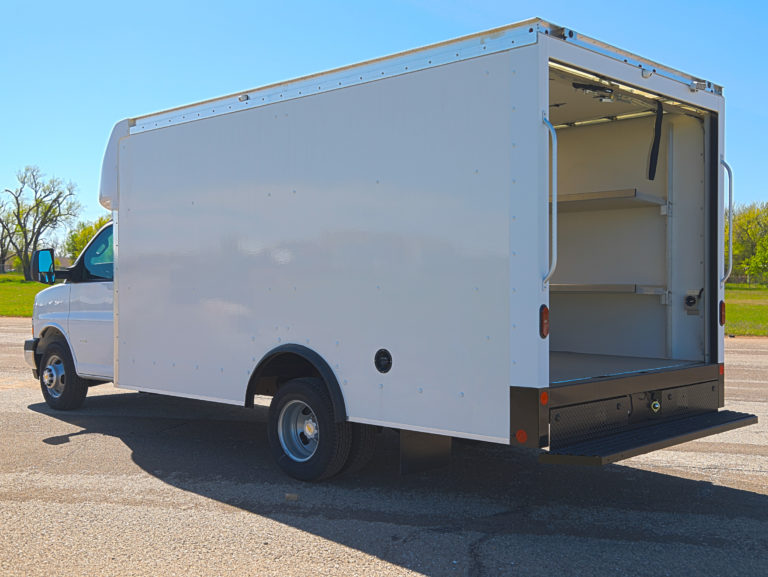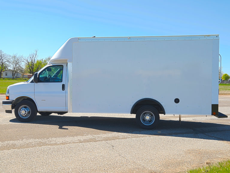 This 2022 Chevrolet Express 3500 Cutaway is a specialized FedEx Ground Specification unit, featuring a 14' Rockport ParcelPort body. Engineered for high-frequency urban delivery, this truck is fully equipped with advanced security, 360-degree visibility, and high-durability cargo features to maximize route efficiency.