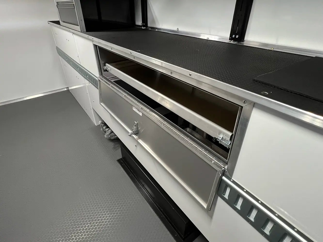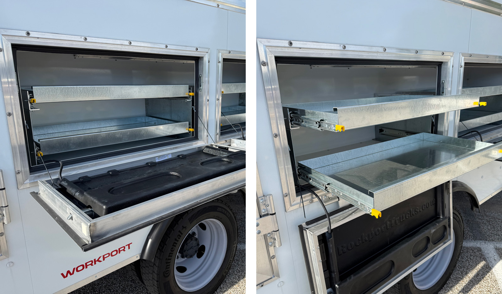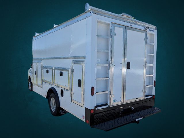 This 2023 Ford E-450 Super Duty features the highly versatile 14' Rockport Workport body. Designed for trades that require a mobile workshop environment, this unit combines the heavy-duty 7.3L V8 "Premium" engine with an expansive exterior-access compartment system, allowing you to organize tools externally while maintaining a 6' 6" standing-height interior workspace.